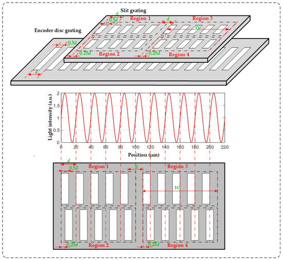 The configuration of the four-field scanning method for the optical encoder is illustrated in Figure 4. This method employs a code disc grating and a slit grating with identical periods. The slit grating is divided into four regions, each spatially offset by one-quarter of a period relative to the next.