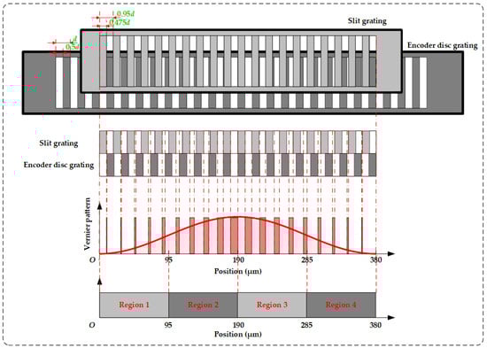 The single-field scanning method for photoelectric encoders employs a slight mismatch between the periods of the code disc grating and the slit grating. When overlaid, this period difference creates a Vernier structure with a period much larger than the original gratings. A schematic diagram of the configuration with a disc grating period of d and a slit grating period of 0.95d is shown in Figure 5, wherein both gratings have a 50% opening ratio. By uniformly arranging four groups of photodetectors within one period of the resulting Vernier structure to collect the light intensity distribution, four photoelectric signals with sequential 90° phase differences can be acquired.