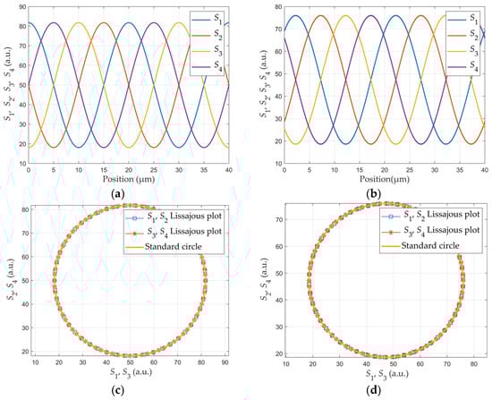 Simulation experiments for both scanning methods were conducted in MATLAB R2020b based on Equation (8), configured with parameters A = 1, B = 1, and φ = 0. The code disc grating period was set to d = 20 μm, an industry-standard value for high-precision optical encoders, thereby grounding our model in a practical context. For the four-field method, the region width was set to W = 100 μm. For the single-field method, the slit grating period was set to 19 μm, creating a 1 μm period mismatch with the disc to generate the Vernier effect. The relative displacement Δx was varied from 0 to 40 μm in steps of 0.001 μm. The resulting quadrature signals S1–S4 from the four-field and single-field methods are shown in Figure 6a and Figure 6b, respectively. The Lissajous figures for (S1, S2) and (S3, S4) are presented in Figure 6c,d. The results demonstrate that both scanning methods generate sinusoidal signals with excellent orthogonality and amplitude consistency.