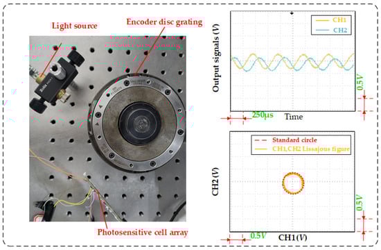 The experimental system configuration and the corresponding Lissajous figures of the output signals are presented in Figure 7. The system employs a code disc grating with a period of 20 μm and an opening ratio of 50%, alongside a photoelectric sensor array with a period of 38 μm and a 1:1 width ratio between its photosensitive and non-photosensitive regions. The grating self-imaging signal was acquired under illumination by a collimated light source with a central wavelength of 650 nm. The experimental results indicate that the method successfully retrieves quadrature sinusoidal signals. However, the Lissajous figure exhibits a measurable deviation from a standard circle, suggesting the presence of harmonic distortion in the output signals.