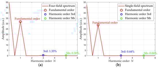 Harmonic components in the output signals: (a) harmonic components with four-field scanning method; (b) harmonic components with single-field scanning method.