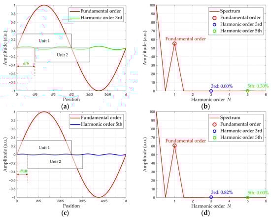 Scanning unit offset and harmonic spectrum: (a) scanning unit offset with Δt = d/6; (b) output signal harmonic spectrum with Δt = d/6; (c) scanning unit offset with Δt = d/10; (d) output signal harmonic spectrum with Δt = d/10.