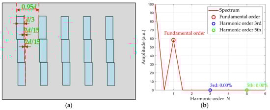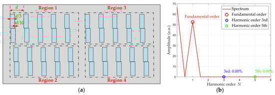 For the four-field scanning method, the width of the photosensitive unit within each scanning region is set to one-third of the code disc grating period to eliminate the third harmonic. Additionally, each unit is divided into two sub-cells with a spatial offset of Δt = d/10 to cancel the fifth harmonic. Figure 11a shows the layout of the photosensitive sensor array, where the blue rectangles represent the photosensitive cells, and the composite scanning regions replace the slit-grating configuration while implementing the above optimizations. Simulation results based on Equation (12), presented in Figure 11b, indicate that both the third and the fifth harmonic components in the output signal are 0.00%. The content of the third and fifth harmonics in the output signal is significantly reduced. These results demonstrate that the proposed scanning unit design can be effectively integrated into the four-field scanning method to achieve efficient suppression of the target harmonic components.