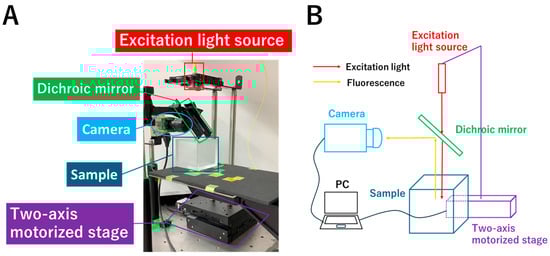 System for the limited proof-of-concept experiment (A) and its schematic diagram (B). The 785 nm excitation light source is connected to a two-axis motorized stage, which is connected to a controller and a PC, and was operated using a PC program. The excitation light passes through a dichroic mirror placed at 45° and is used to scan the sample containing the fluorophore. The fluorescence emitted upward is reflected by the dichroic mirror and detected by the camera.