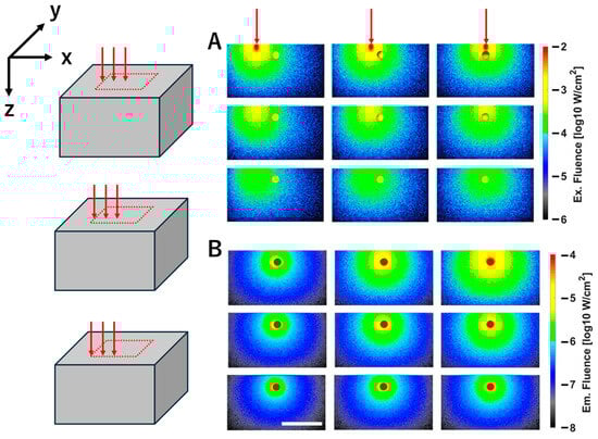Fluence map of excitation (A) and fluorescence (B) for a fluorescent tumor embedded at a depth of 4 mm. The panels represent nine results obtained by varying the excitation light irradiation position. Three red arrows above the excitation maps indicate that the excitation light irradiation positions change along the X direction at 5 mm intervals from right to left. On the left side, three diagrams indicate that the excitation light irradiation positions change along the negative direction of the Y axis at 5 mm intervals from the center of the fluorescent tumor. (A,B) show the XZ cross-sectional view through the center of the fluorescent tumor. The white scale bar in the figure represents 20 mm. Color bars indicate fluence values on a logarithmic scale (log10 W/cm2).