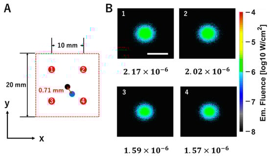 Evaluation of the accuracy of two-dimensional position estimation for the fluorescent tumor. (A) The left panel shows a top view of the 20 × 20 mm excitation light scanning area on the model surface (XY plane). The red circles labeled with the numbers 1–4 indicate the 4 excitation light irradiation coordinates used for the centroid calculation (1: (200, 300); 2: (300, 300); 3: (200, 200); 4: (300, 200)). The black circle represents the center coordinate of the embedded fluorescent tumor (250, 250), while the blue circle represents the centroid coordinate (248.84, 242.99) corresponding to the estimated position of the fluorescent tumor. The distance between these coordinates (indicated by the red arrow) is 0.71 mm. (B) Right panels are the fluorescence fluence maps on the model surface obtained by irradiating excitation light at each coordinate marked with red circles labeled 1–4. The white scale bar shown in the fluence map represents 20 mm. The fluorescence fluence values are shown at the bottom of each map (1: 2.17 × 10−6; 2: 2.02 × 10−6; 3: 1.59 × 10−6; 4: 1.57 × 10−6). The color bar indicates fluence values on a logarithmic scale (log10 W/cm2).
