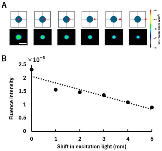 Relationship between the excitation light irradiation position shift and the fluorescence fluence. (A) The top row shows schematic illustrations of the excitation positions and the corresponding fluorescence fluence map on the surface of the model, displayed on a logarithmic scale (log10 W/cm2). A spherical fluorescent tumor (blue) was positioned at a depth of 3 mm, where the excitation light (red) was incrementally shifted to the right from the tumor center at 1 mm intervals. The white scale bar shown in the fluence map represents 20 mm. (B) The bottom graph plots the average fluorescence fluence obtained from each fluence map. The horizontal axis indicates the lateral displacement of the excitation light from the tumor center, and the vertical axis indicates the corresponding average fluorescence fluence (W/cm2) calculated over a 10 × 10-pixel area centered at the centroid pixel of the fluorescence distribution. The dotted line is a regression line added to indicate the trend in the change in intensity.