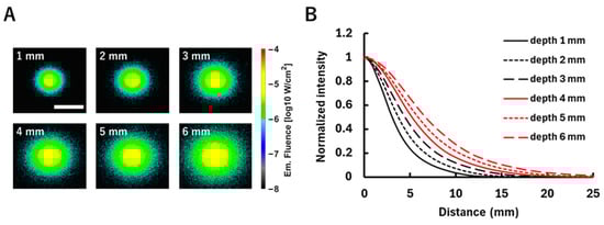 The fluorescence distribution for the fluorescent tumor embedded at different depths (1–6 mm). (A) Fluorescence fluence maps on the model surface when excitation light is irradiated directly above the fluorescent tumor at each depth. Fluence values are shown on a logarithmic scale (log10 W/cm2). The white scale bar in the figure represents 20 mm. (B) Diffuse fluorescence profiles derived from the corresponding fluence maps. This shows the relationship between the distance from the excitation light irradiation position and the change in fluorescence fluence corresponding to that distance. The vertical axis is normalized to the maximum fluence at each depth.