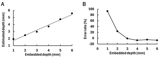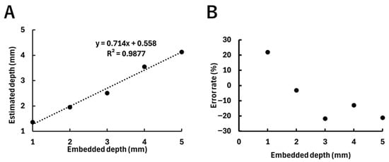 Results of the estimated depths of the fluorophore, with plots indicating the averages of three experiments. (A) Relationship between the embedded depth of the fluorophore and the estimated depth. The dotted line indicates the regression line (y = 0.71x + 0.56, R2 = 0.99). (B) Relationship between the embedded depth of the fluorophore and the error rate of the estimated depth.