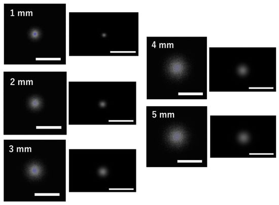 To estimate the depth of the fluorophore, the excitation light intensity was adjusted at each depth from 1 to 5 mm so that the fluorescence intensity reached the maximum level without saturation. The excitation light intensities at depths of 1–5 mm were 0.2, 1.9, 4.2, 8.4, and 15.0 mW, respectively. Because the maximum output of the excitation light source in the experimental system was 20 mW, the experiment at a depth of 6 mm was not performed to avoid the risk of damaging the light source. For each depth, the image obtained when the excitation light was irradiated directly above the fluorophore was used in the analysis. Following the methodology of a previous study [9], a Gaussian filter was applied to each acquired image at each depth, which were then converted into diffuse fluorescence profiles, to which Equation (2) was fitted to obtain the estimated fluorophore depth. For each depth from 1 to 5 mm, three experiments were performed.
