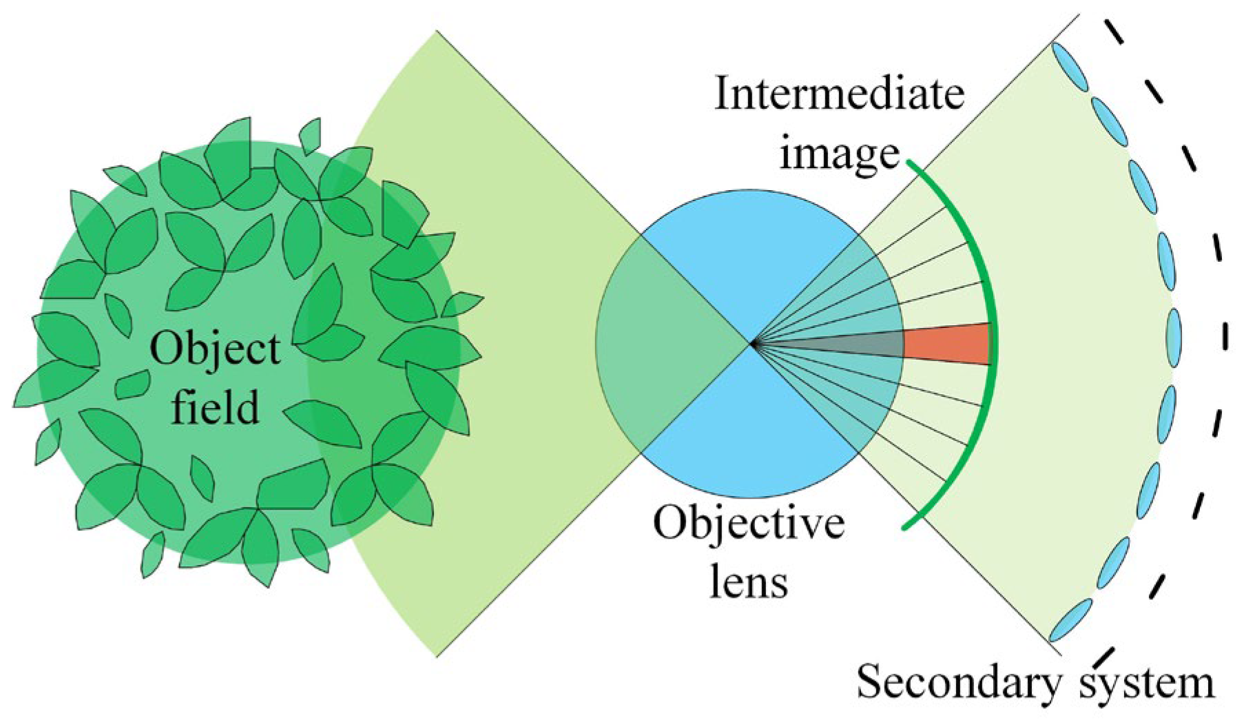 26]. The multi-scale monocentric optical system effectively addresses the issue of varying aberrations at different field-of-view positions, which require different secondary relay systems and an asymmetric arrangement for aberration correction. Due to the rotational symmetry of the FOV provided by the spherical primary lens, a larger FOV can be achieved, with the resulting intermediate image plane being spherical. The aberrations at different positions on the intermediate image plane are identical. Therefore, the secondary relay system can be completely symmetric and arranged uniformly on the sphere behind the intermediate image plane. This advantage significantly simplifies the optical system’s structure, reduces processing costs and assembly difficulties, and represents the most effective method for achieving both a large FOV and high resolution imaging simultaneously. The schematic diagram of the multi-scale monocentric optical imaging system is shown in