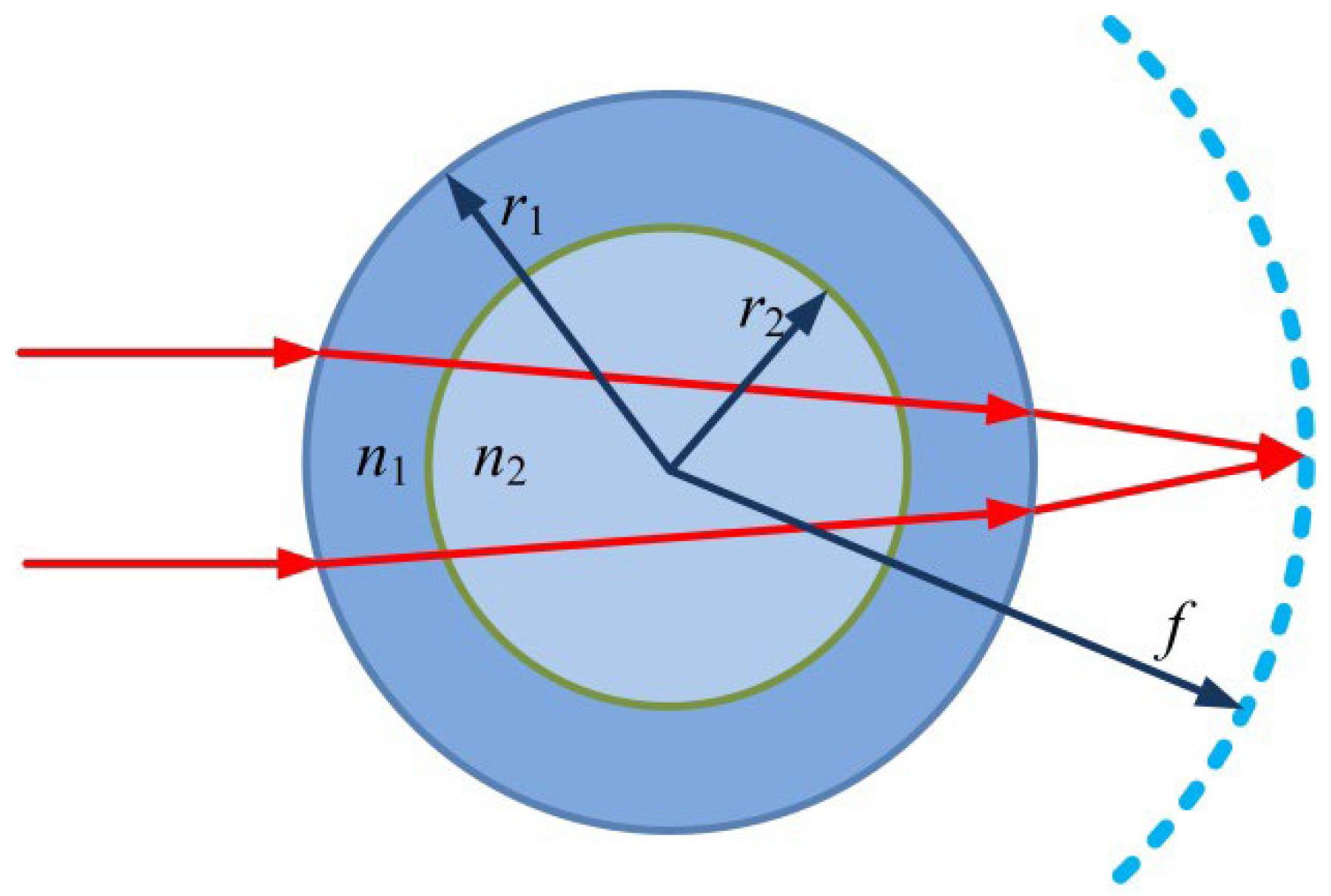 According to the theory of paraxial optics, the formula for calculating the focal length of the double-layer monocentric spherical lens can be derived, as shown in Equation (1), where