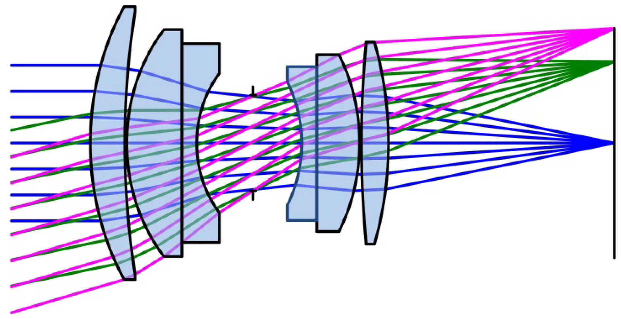 Figure 4 with the six-piece double-Gaussian lenses shown in