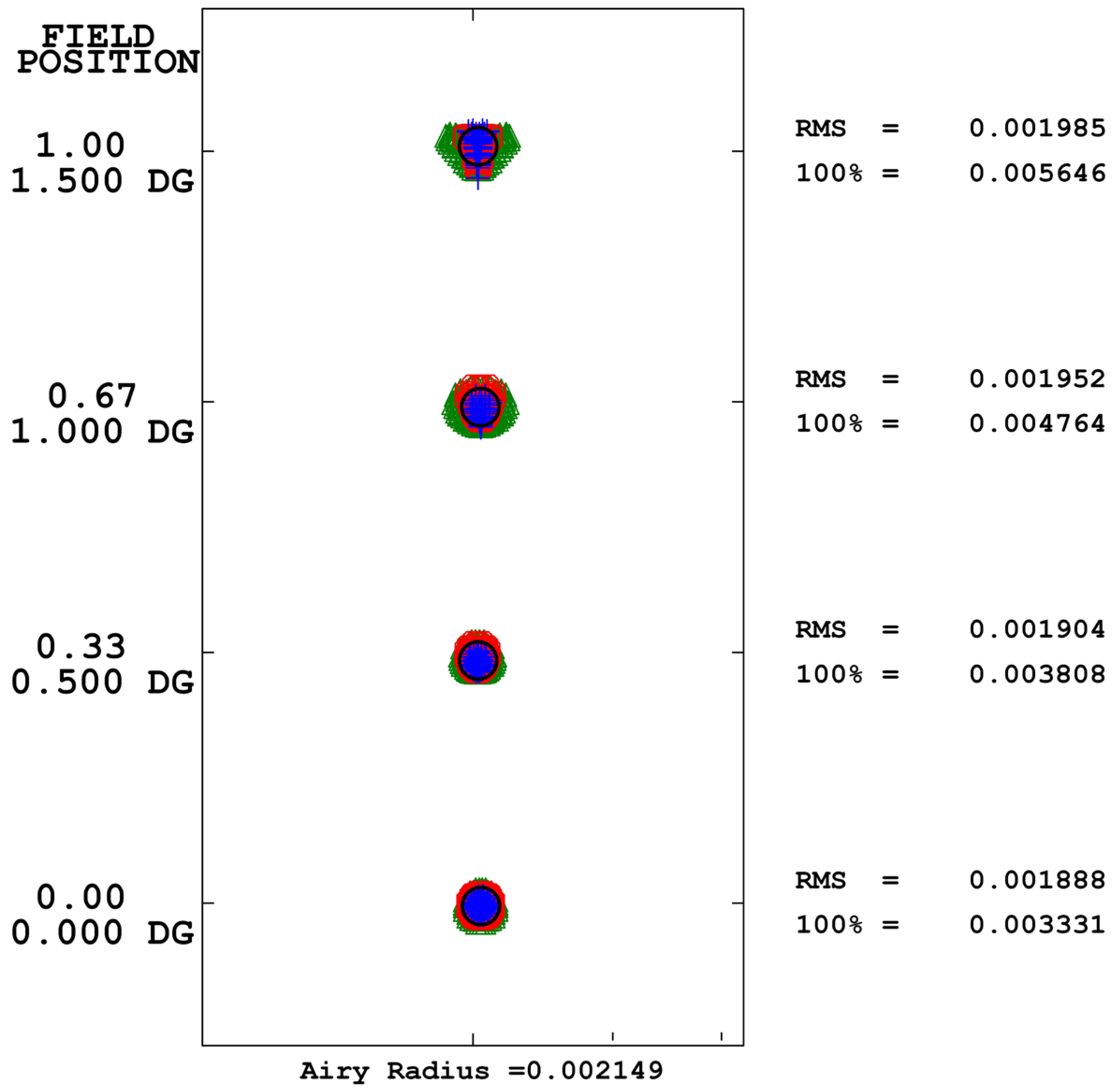 Figure 6. The design wavelengths are 450 to 650 nm for visible wavelengths. Some other information about the optical system include an F-number of 3, a focal length of 55.8 mm, and a field of view of ±1.5°.
