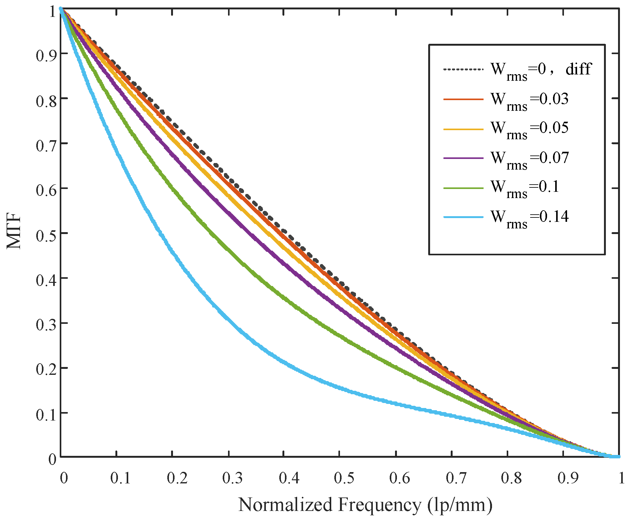 Figure 8, as the wavefront aberration increases, the MTF of the optical system decreases significantly, deviating further from the optical transfer function curve of the diffraction limit.