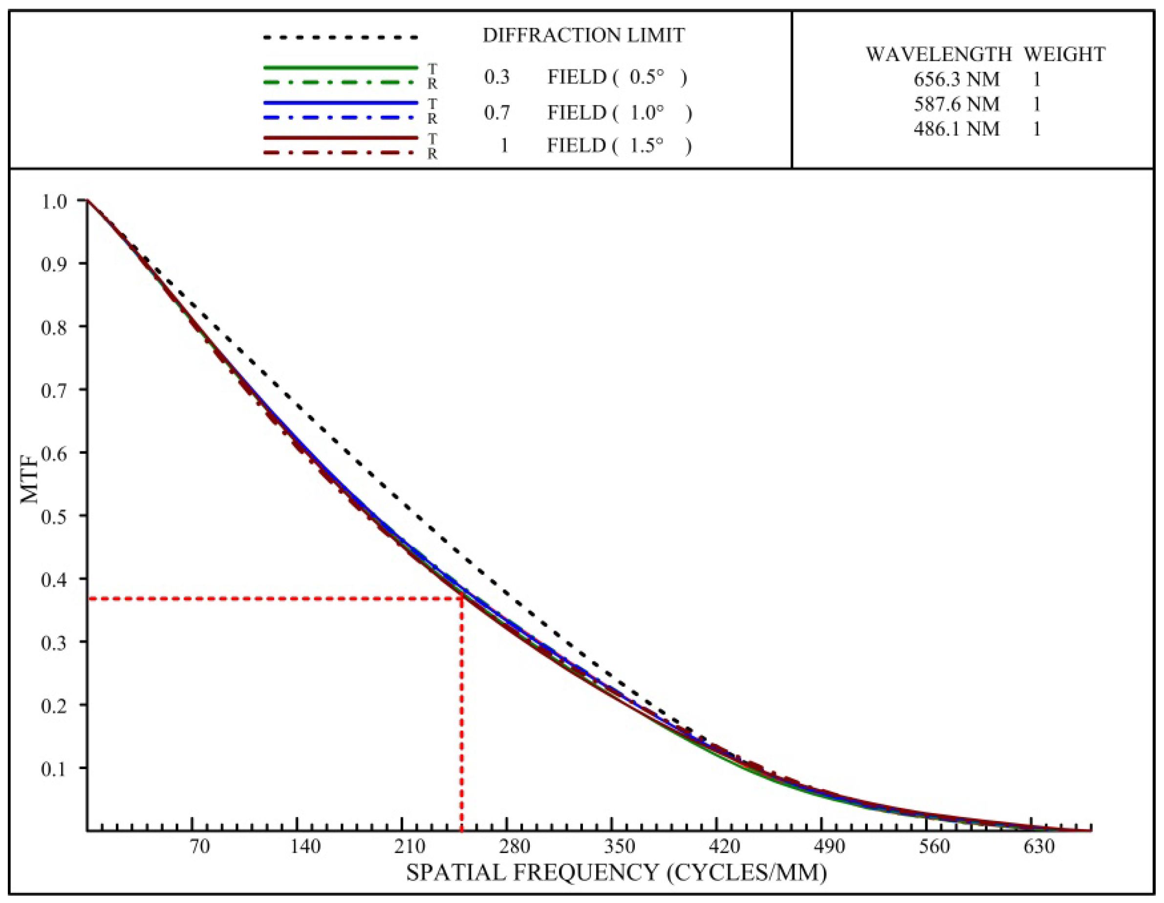 Figure 9, the MTF curves for each FOV are consistent and closely follow the diffraction limit curve. By comparing the MTF curves in