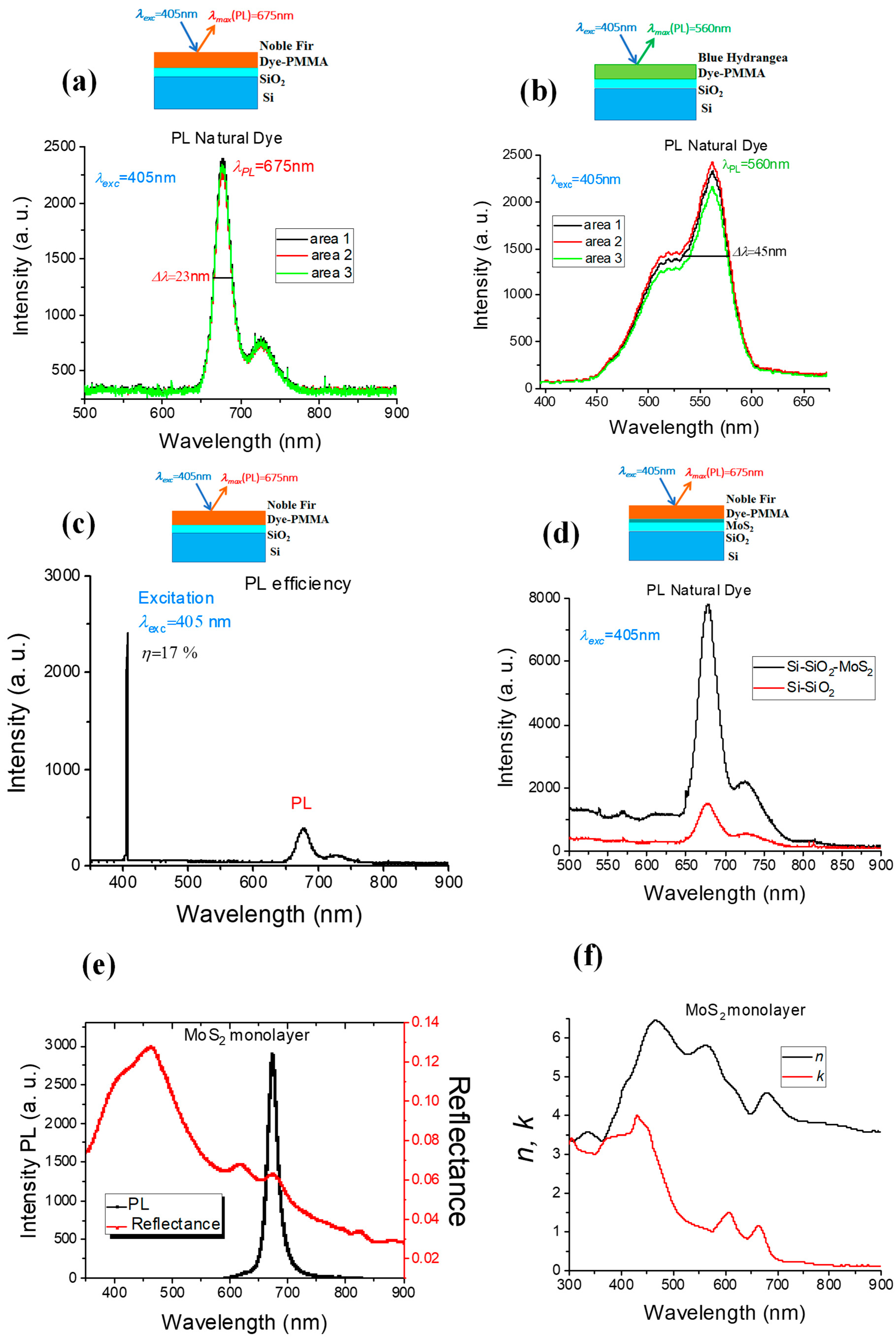 - Chaithra, R.; Harshitha, D.; Renuka, C.G. Unlocking the Photoluminescence Potential of Tabebuia Rosea Dyes: A Novel Natural Source of Broadband Visible Spectral Fluorescence for OLED Technologies. J. Fluoresc. 2025, 35, 7959–7984. [Google Scholar] [CrossRef]