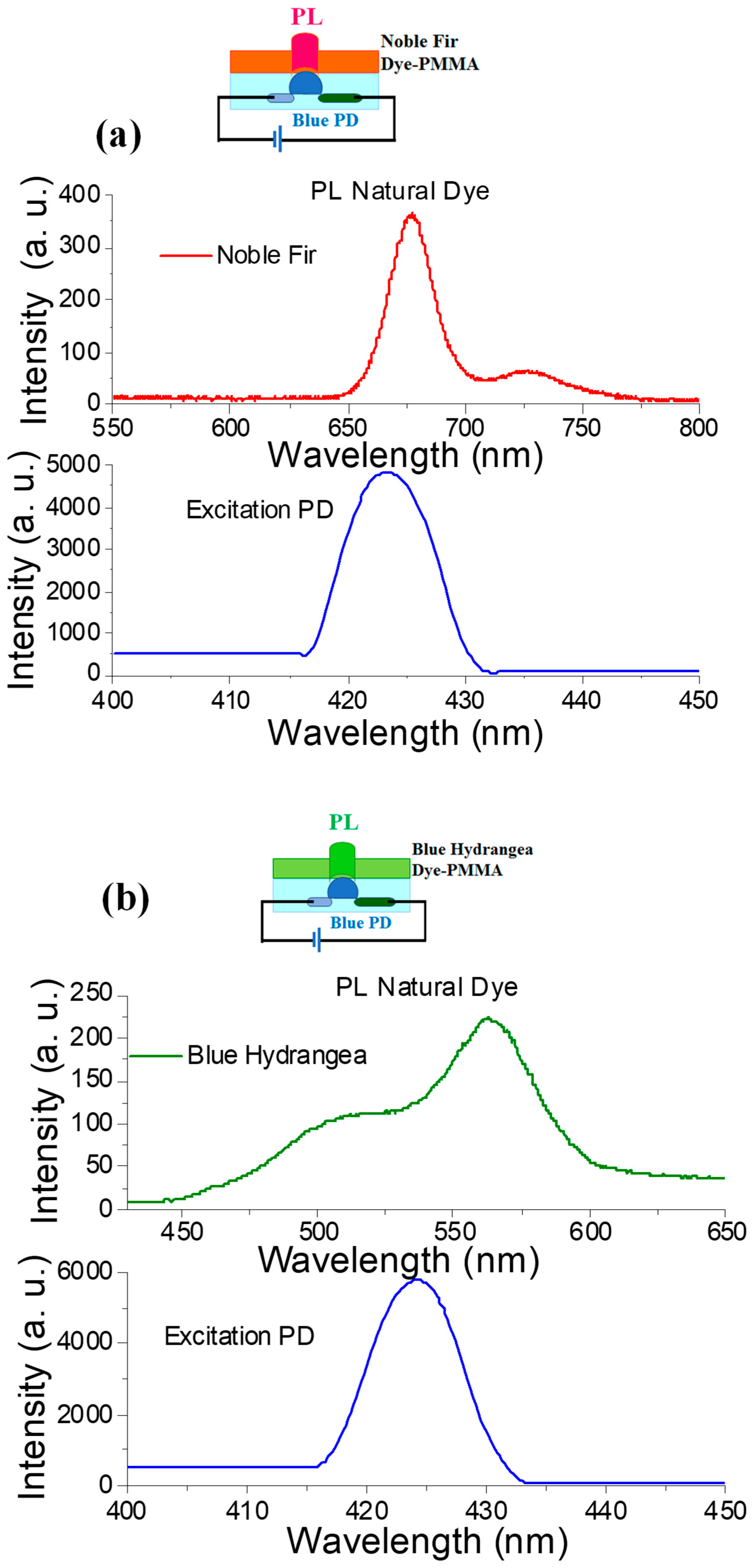 3.4. PL Performance Based on Natural Dyes Excited by Blue GaN Photodiode