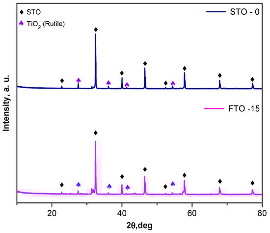 No diffraction peaks corresponding to iron oxides (e.g., Fe2O3 or Fe3O4) were observed, suggesting that Fe is successfully incorporated into the perovskite lattice. The retention of the cubic phase and the absence of significant peak broadening indicate good crystallinity of both STO-0 and FTO-15 powders. The average crystallite size of the samples was estimated using the Scherrer equation [23], based on the full width at half maximum (FWHM) of the (110) diffraction peak. The undoped SrTiO3 (STO-0) sample exhibited a crystallite size of approximately 30 nm, while the Fe-doped SrTiO3 (FTO-15) sample showed a reduced crystallite size of 20 nm. The decrease in crystallite size upon the introduction of iron may be attributed to the incorporation of Fe3+ ions into the Ti4+ lattice sites, which can introduce lattice strain and probably inhibit grain growth during calcination [24,25].