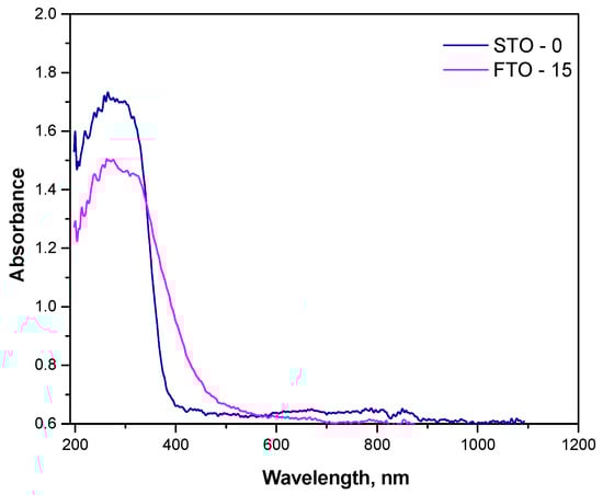The optical absorption behavior of the synthesized SrTiO3 (STO-0) and Fe-doped SrTiO3 (FTO-15) powders was investigated using UV-Vis diffuse reflectance spectroscopy, and the spectra are presented in Figure 5. The corresponding plots used to determine the optical band gaps via the Kubelka-Munk function have been presented in our previous work [18]. Both samples exhibit strong absorption in the UV region, which is characteristic of perovskite-type titanates. However, significant differences in the absorption edges and intensities were observed between the two samples.