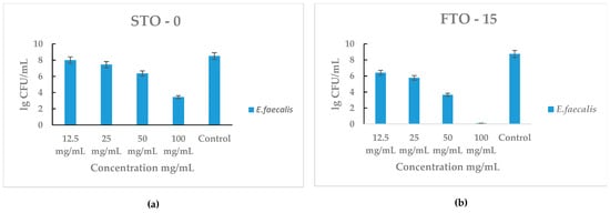 For STO-0 (Figure 8a), moderate inhibition of E. faecalis was observed at concentrations ≥ 50 mg mL−1, with a substantial reduction at 100 mg mL−1 compared with the control (~8 lg CFU mL−1). In contrast, FTO-15 (Figure 8b) demonstrated stronger antibacterial activity, showing a pronounced decline in bacterial counts even at lower concentrations. Complete loss of cell viability of E. faecalis was achieved at 100 mg mL−1, which corresponds to the minimum bactericidal concentration (MBC) for this material.