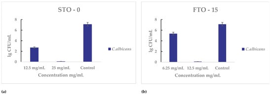 Antimicrobial activity of STO-0 and FTO-15 materials against Candida albicans: (a) Viable cell counts (lg CFU mL−1) of C. albicans after exposure to STO-0 at concentrations of 12.5–25 mg mL−1, (b) Viable cell counts (lg CFU mL−1) of C. albicans after exposure to FTO-15 at concentrations of 6.25–12.5 mg mL−1.