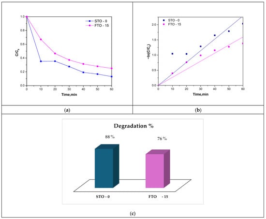 The kinetics of the degradation process were evaluated using the Langmuir-Hinshelwood pseudo-first-order model. The plots of −ln(C/C0) vs. time (Figure 11b) showed linear behavior with high correlation coefficients (R2 = 0.9874 for STO-0 and 0.9704 for FTO-15), confirming that the degradation follows first-order kinetics. The calculated rate constants were k = 0.0351 min−1 for STO-0 and k = 0.0259 min−1 for FTO-15, consistent with the observed differences in photocatalytic performance with corresponding half-lives of 18.2 and 23.2 min (Table 2), respectively, further reflecting the faster degradation efficiency of STO-0.