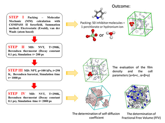 As the experimental determination of thin inhibitor film formation at the interface of corroding metals is rather difficult [27], the film density of the inhibitors was determined using PBC (Periodic Boundary Conditions) by applying MD steps, as presented in Figure 1 (from STEP III).