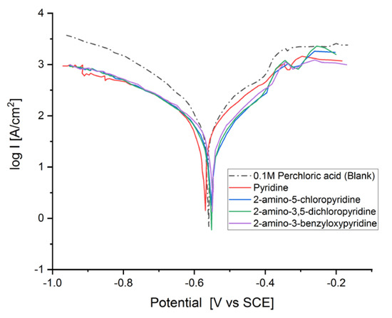 The Tafel graph of the MS electrode in 0.1 M HClO4 are shown in Figure 2, in the absence and presence of pyridine inhibitors at 1 × 10−3 M concentration at 298 K. The inhibition efficiency (IE (%)) was calculated as follows [6,18]:
