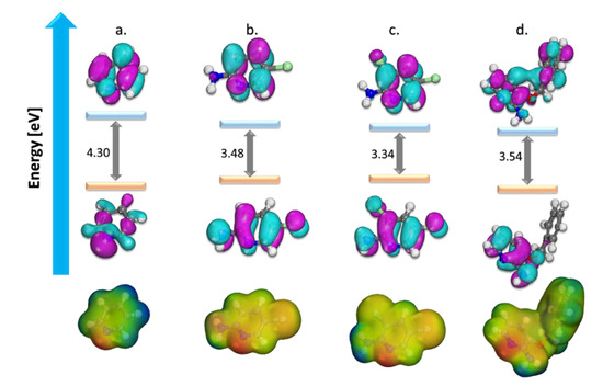 Optimized structure, HOMO, LUMO surfaces, and MEP for (a) pyridine, (b) 2-amino-5-chloropyridine, (c) 2-amino-3,5-dichloropyridine, and (d) 2-amino-3-benzyloxypyridine.