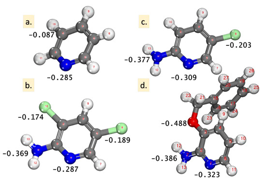 Mulliken atomic charges (MAC) were demonstrated as a valuable parameter for the designation of the accountable sites (atoms) of the inhibitors that were prone to adsorption onto the metals. The interaction between Fe(110) and the inhibitor molecules was frequently taken to favorably occur on the atom with a large negative charge [19,21,22,25]. The MAC value for the inhibitors is presented in Figure 4, where the highest negative charge on all of the inhibitor molecules are located on nitrogen atoms (and also on O for the 2-amino-3-benzyloxypyridine molecule), denoting that these centers have the largest electron density and interact with the Fe(110). This electron density is visible also in Figure 3 in the visualized electrostatic potential (MEP) for the pyridine molecules.