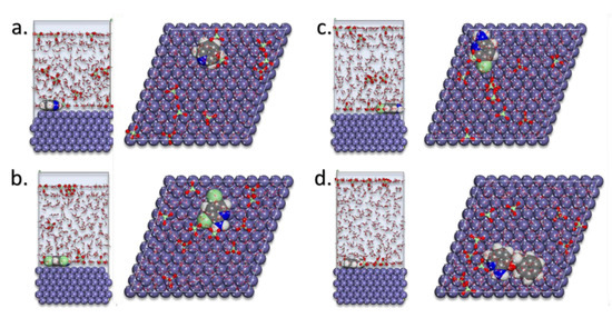 MD poses of the lowest adsorption configurations for the pyridine inhibitors: (a) pyridine, (b) 2-amino-5-chloropyridine, (c) 2-amino-3,5-dichloropyridine, and (d) 2-amino-3-benzyloxypyridine in the simulated corrosion media on the Fe(110) substrate.