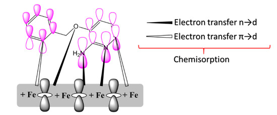 From the obtained experimental and theoretical results, we propose the adsorption mechanism presented in Figure 8. The pyridine inhibitors were chemically adsorbed onto the MS surface by donor/acceptor interaction amongst free electron pairs of heteroatoms (N, O, and Cl) and the vacant d-orbital of the MS surface. An important factor on the adsorption was the donor/acceptor interaction among the anti-bonding molecular orbitals of pyridine inhibitors and the d-orbitals of iron atoms of the surface [40].