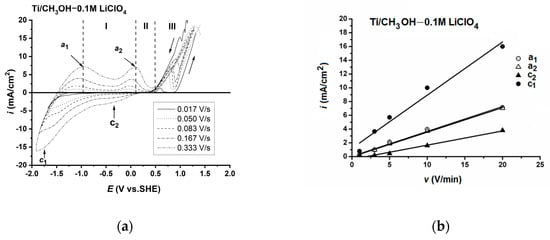 Polarisation curves of Ti in anhydrous CH3OH-0.1 M LiClO4: I—first pseudopassive range, II—second pseudopassive range and III—transpassive range (a). Linear dependence of anodic and cathodic peaks current on the potential sweep (b).