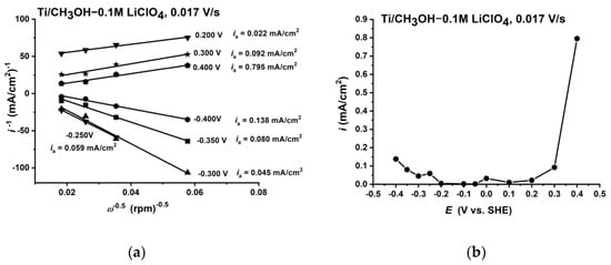 From the Koutecky–Levich plots (Figure 2a) obtained from the anodic and cathodic branches of the polarisation curves presented in Figure S1 (supplement materials) and its extrapolation to ω−0.5→0, we could calculate the values of the kinetic current ik. Over the entire investigated potential range, the current ik was anodic (Figure 2b). The small dependence of ik on the potential up to 0.2 V showed that the anodic dissolution of titanium was effectively blocked. The imposition of the diffusion-controlled cathodic current (likely corresponding to the reduction of methanol) and the anodic current of the oxidation reaction of titanium (passivation process) was also observed. The reduction of methanol proceeded with the formation of CH3O− anions that were readily adsorbed on the electrode surface, especially in the potential range of the parallel anodic reaction of the formation of titanium compounds at lower oxidation states (Ti2+ and Ti3+). The formation of a Ti-OCH3 surface compound led to surface blocking and inhibition of the methanol reduction.