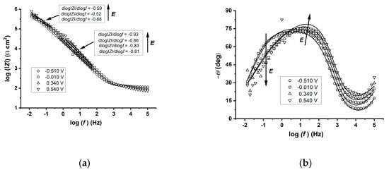 The Bode diagrams for Ti polarised potentiostatically at specified potentials (−0.510, −0.010, 0.340 and 0.540 V vs. SHE) in the tested solution (Figure 3) revealed blocking properties related to the formation of a barrier surface layer. The analysis of the dlog|Z|/dlog(f) slope (Figure 3a) allowed for distinguishing a low-frequency range with a slope value close to −0.5 and a medium-frequency range with a slope close to −1.0. The relationship between the negative phase angle and frequency exhibited two minima (Figure 3b). The first high-frequency minimum (f > 105 Hz) was probably associated with the electronic system. We did not interpret this range because it was not related to Faraday processes or the pseudocapacity of the layer on the Ti surface.