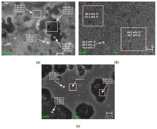 The titanium sample etched in the first pseudo-passive range (E = −0.3 V vs. SHE) was covered with a layer consisting mainly of O- and C-containing compounds (Figure 4a). The dark spots indicated a layer with high carbon content and with a small contribution of titanium. The SEM picture of the Ti-etched surface in the second pseudo-passive range (E = 0.123 V vs. SHE) (Figure 4b) showed a surface covered with a thin compact film with white spots. These spots consisted mostly of oxygen and carbon. The analysis of the Ti etched surface at E = 0.6 V vs. SHE (Figure 4c) revealed the strong corrosion of metal. The bright areas consisted of pure Ti, whereas the darker regions were enriched with O and C. The presence of such a large amount of carbon in the surface layer suggests that the layer was not an oxide layer, but rather a methoxy film.
