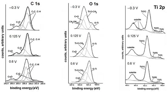 The XPS spectra are presented in Figure 5. The high-resolution peak core levels were analysed through a deconvolution fitting of the complex spectra. The binding energies and the corresponding quantification (%) of each peak component are presented in Table S2. The analysis of the C1s level spectra for the Ti etched in CH3OH-0.1 M LiClO4 at the potential of the first pseudo-passive range (E = −0.3 V vs. SHE) indicated the presence of carbon bonded with oxygen and carbon in the hydrocarbon group. The dominant peak, with the energy of approximately 285 eV, corresponded to the presence of the C–C and C–H bonds (adventitious carbon) [,,]. The peak of energy of about 286 eV was assigned to C–O bonding and the signal at 289 eV was related to C=O bonding []. The same binding energies were recorded for the species of the surface layer formed on Ti after etching at the potential in the second pseudo-passive range (E = 0.123 V vs. SHE) and at the potential of the transpassive region (E = 0.6 V vs. SHE). The only change was the intensity of the bands.