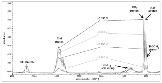 FTIR-ATR spectra of the Ti layer obtained at various polarisation potentials (E = −0.650, −0.250, −0.100, +0.150 V vs. SHE) in an anhydrous deaerated CH3OH-0.1 M LiClO4 solution [].