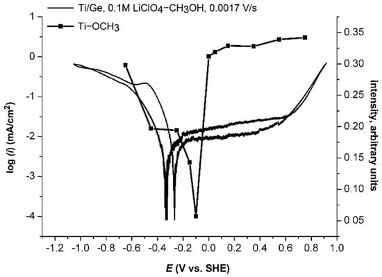 The analysis of the intensity of bands that came from the Ti-OCH3 group compared with the polarisation curve of Ti on Ge demonstrated the increase of the methoxy group’s intensity towards both cathodic and anodic potentials (Figure 7).