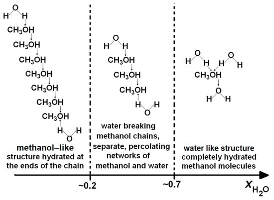 The structure of the methanol–water interactions in the tested solution can be described using the scheme proposed by Dixit et al. []. The figure reveals three ranges of solution structure associated with the low, medium and high concentrations of water (Figure 8).