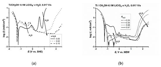 Figure 9 illustrates the effect of water on the course of the anodic polarization in a 0.1 M LiClO4-CH3OH xH2O solution. Regardless of the presence of water, the titanium surface remained blocked at the potential range corresponding to Ti(III) stability (the area between the first and second anodic peak). This pseudo-passivation formed in the anhydrous methanol-LiClO4 solution was the effect of the methoxylation of the metal electrode surface and formation of the Ti-OCH3 surface film, whose formation was described in the previous section.