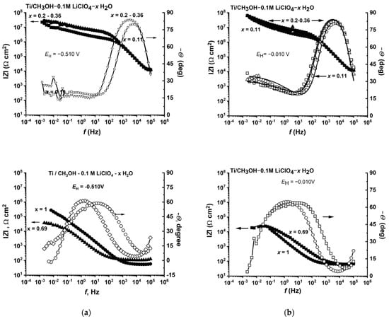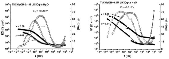 The results of impedance measurements, performed in the potential range of −0.510 V to −0.01 V (range of pseudo-passive layer stability) confirmed the important role of the water–methanol interactions on the anodic behavior of titanium (Figure 10). Impedance diagrams for the methanolic solutions at low (≤0.02 mol fraction) and high (≥0.69 mol fraction) water content had a shape corresponding to the titanium passivation. In the low water-content range, there was methanolate pseudo-passivation, while in the high water-content solutions, oxide passivation took place. In the range of medium water content (0.1 to 0.36 mole fraction), the impedance spectrum corresponded to the metallic surface being blocked with the membrane of very high resistance and very low capacitance, which is presented in Figure S5.