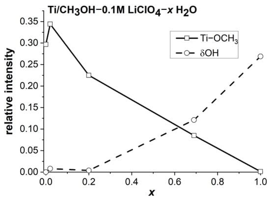 The in situ FTIR-ATR measurements of Ti in 0.1 M LiClO4 CH3OH x H2O solutions at potentials of the pseudo-passive range of polarisation (−0.1 V) confirmed the results of the polarisation studies. The intensity of the Ti-OCH3 band (Figure S6) decreased with an increase in water content (Figure 11 and Table S3). The band intensity due to the water hydroxyl group started to increase only when the water concentration exceeded the value of 0.2 mole fraction, which means that the OH groups took part in the formation of the Ti(OH)m(OCH3)n surface film, where m + n = 3.