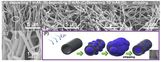 Scanning electron microscope (SEM) images of carbon nanofibers as Li is deposited (A–C,E) or stripped (D), a process shown schematically in the inset (F). Reprinted from reference [41], © 2020 used with permission from Elsevier.