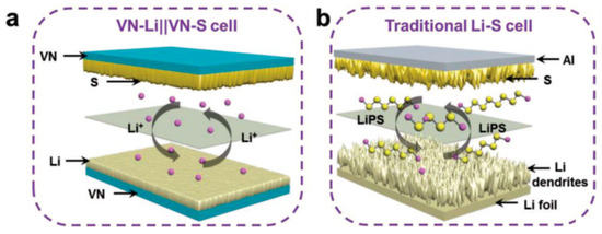 Comparison of the vanadium nitride-supported cell (a) to the traditional Li-S cell (b). Reprinted from reference [42], © 2020 used with permission from John Wiley and Sons.