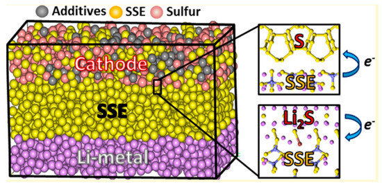 One strategy bent on attenuating the polysulfide shuttle issue in solution is to employ sulfide solid-state electrolytes (SSEs) [9,21,22,23,24], an approach that will likewise attenuate the possibility of Li battery fires fueled by flammable organic electrolytes. A recent study employing simulation using density functional theory (DFT) and ab initio molecular dynamics has sought to understand processes by which the cathode and SSE interface with S8 or Li2S (Figure 4) [87]. The authors specifically explored β-Li3PS4, Li6PS5Cl, and Li7P2S8I, as these materials have demonstrated superionic conductivity of Li+. The simulations provide some insight into adhesion and interfacial energy for these materials, allowing for some speculation on the mechanisms of interfacial reactions. These simulations should be followed up with experiments and imaging techniques in an effort to validate them and, if the simulations prove predictive, further simulations will guide additional work in the field.