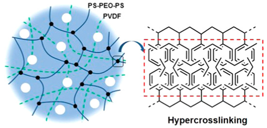One source of shuttle problems is the solubility of polysulfides and related species in the organic electrolytes of traditional Li-S batteries. One potential solution to this issue is to use a polymerized or polymer gel electrolyte [12]. For example, a Li-S battery comprising a sulfur cathode and a gel polymer electrolyte of poly(ethyleneoxide)-modified poly(vinylidene fluoride-co-hexafluoropropylene) (PEO-PVDF) was fabricated in which a layer of pentaerythritol tetrakis (divinyladipate) was further added to suppress polysulfide permeability (Figure 5) [88]. These polymers were selected because they are known to exhibit high thermal stability and low thermal expansion, as well as their permeability and ion conductivity potential. The battery so composed featured a porous membrane that could take up 280% by mass of electrolyte, resulting in an ionic conductivity of 9.6 × 10−4 S cm−1 and a lithium cation Li+ transference number of 0.71 at 25 °C. The coulombic efficiency remains near quantitative over 300 cycles with retention over 85% capacity even after 300 cycles at 2 C.