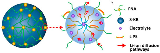 Organic polymers can also be incorporated into batteries in the form of crosslinked micelles that can also carry electrolyte. In one such illustration [44], a copolymer of polyethylene oxide and polypropylene oxide comprising carboxylate and sulfonate groups was used to form the micelles (Figure 6) wherein lithium polysulfides (LiPS) are envisioned to interact along the polar polymer chains. These highly polar and ionic polymer segments, as expected, have a very high affinity for LiPS. Cells having this polymer micelle binder exhibited a reversible capacity of 571 mAh g−1 and, over 100 cycles at 0.5 C, showed a capacity loss of only 0.032%/cycle. These new polymer micelle-containing cells outperform older technologies such as Li-S batteries comprising fluoropolymer components, while also being safer to fabricate and more environmentally friendly.