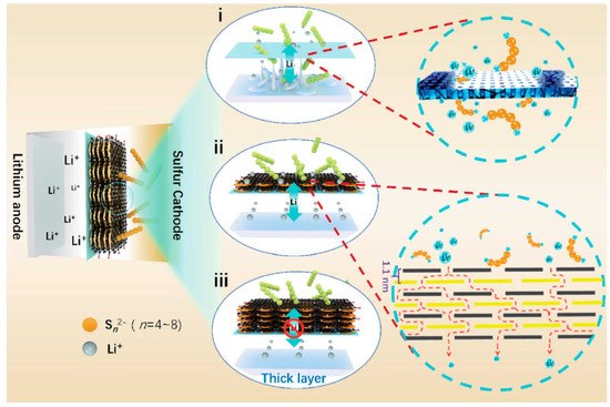 Schematic representation of batteries having polypropylene (PP) separator (i), ultrathin double hydroxide nanosheet/graphene oxide film-modified PP separator (ii), and thicker double hydroxide nanosheet/graphene oxide film-modified PP separator (iii). Reprinted with permission from reference [45]. Copyright 2020 Royal Society of Chemistry.